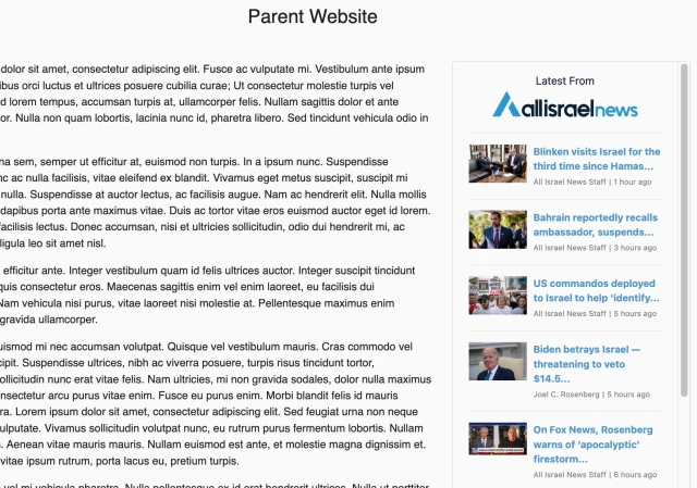 For website publishers, we have developed a newswire widget for you to easily embed into your website that automatically displays the latest headlines from ALL ISRAEL NEWS.