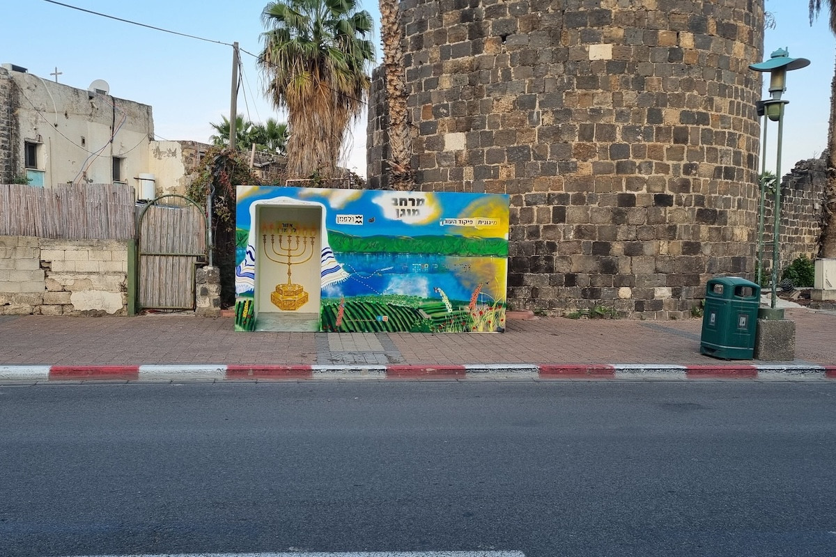 The first shelter has pastoral scenes on the outside with classic Israeli flora and fauna, a beautiful menorah inside, and a “talit” (prayer shawl) draped around the doorway.