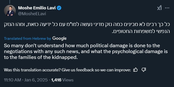 “The families of the hostages are shaken and upset by the list published this morning,” the forum says. “We call on the media and the public to show sensitivity and responsibility regarding the publication of this and other such things until a deal is signed, and also during it.”