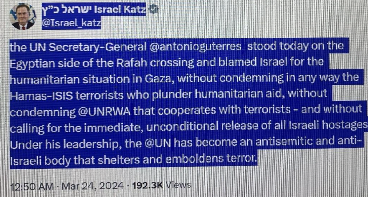 Israel’s Foreign Minister Katz outed Guterres and the United Nations on 24 March 2024: