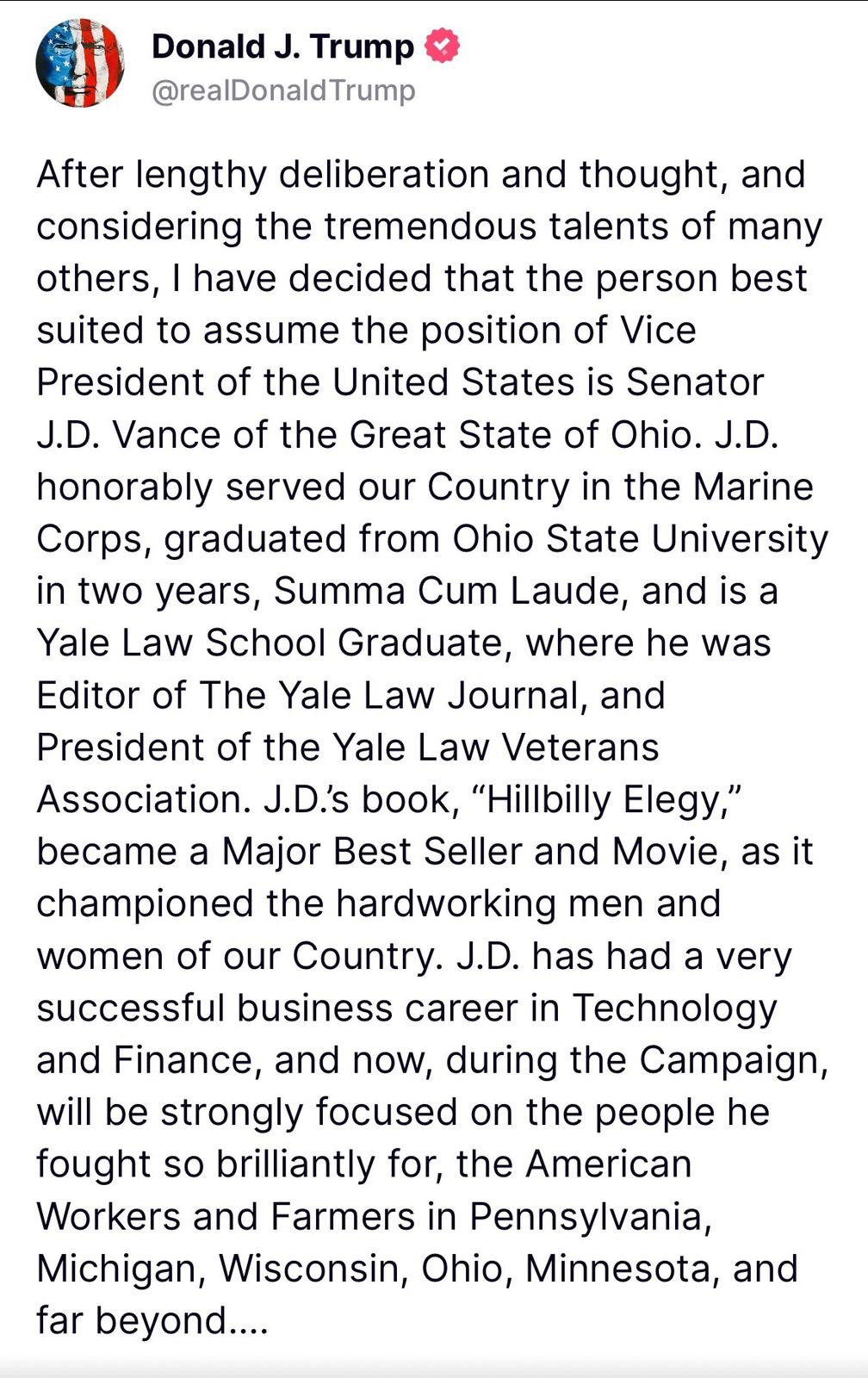 The choice is Ohio Senator J.D. Vance.