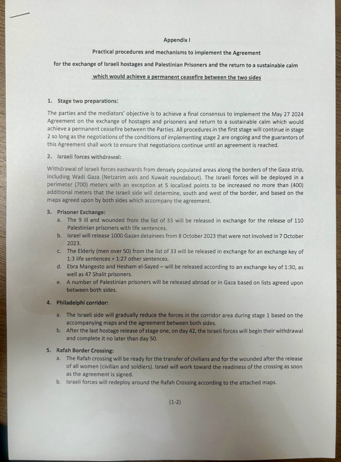 Der Rückzug der israelischen Streitkräfte ostwärts aus dicht besiedelten Gebieten entlang der Grenzen des Gazastreifens, einschließlich Wadi Gaza (Netzarim-Achse und Kuwait-Kreisverkehr). Die israelischen Streitkräfte werden in einem Umkreis von 700 Metern stationiert, mit Ausnahme von fünf lokalisierten Punkten, die um nicht mehr als 400 zusätzliche Meter erweitert werden dürfen. Diese Punkte werden von der israelischen Seite festgelegt, südlich und westlich der Grenze, basierend auf den von beiden Seiten vereinbarten Karten, die der Vereinbarung beigefügt sind.
