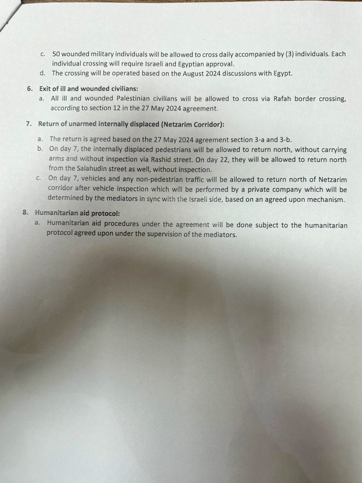 a. Alle kranken und verwundeten palästinensischen Zivilisten dürfen den Grenzübergang Rafah gemäß Abschnitt 12 der Vereinbarung vom 27. Mai 2024 überqueren.