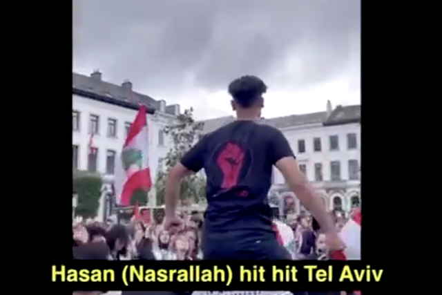 Demonstrators in Brussels, Belgium called for Hezbollah Sec.-Gen. Hassan Nasrallah to “hit Tel Aviv.”