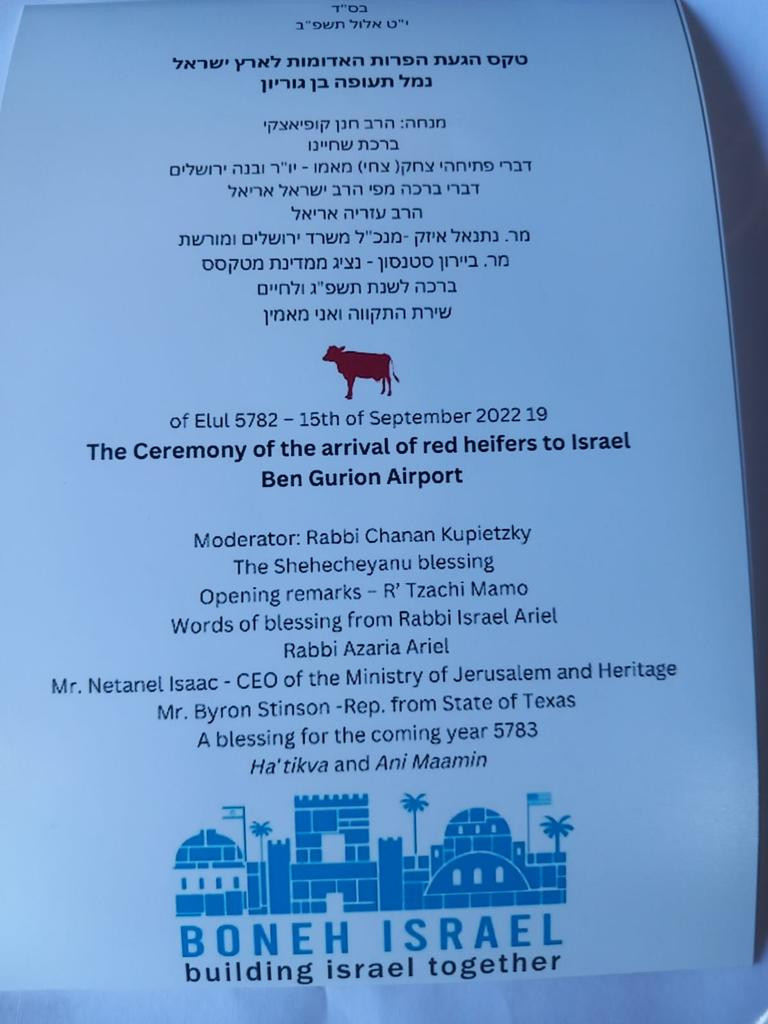The Christian organization, Boneh Israel, located the cattle and, along with the Temple Institute, was responsible for getting them to Israel. Earlier in the year, rabbis from the Temple Institute went to Texas to inspect the cows.