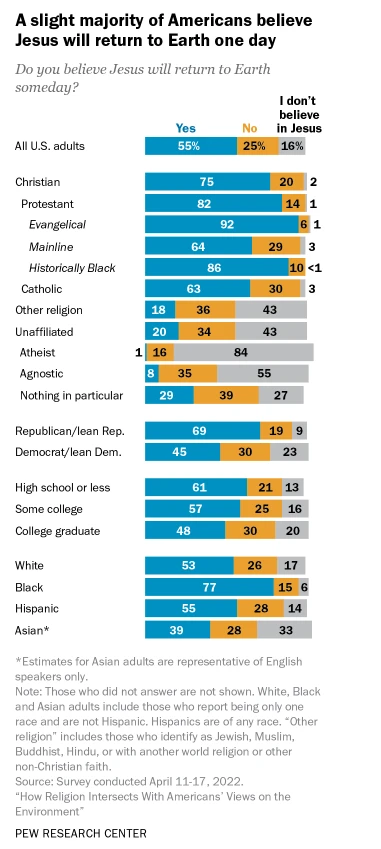 “When asked if Jesus ‘will return to Earth someday,’ more than half of all U.S. adults (55%), including three-quarters of Christians, say this will happen. Protestants in the evangelical (92%) and historically Black (86%) traditions are more likely than other Christians to say there will eventually be a second coming of Jesus. Roughly four-in-ten Americans either do not believe Jesus will return to Earth (25%) or say they do not believe in Jesus (16%).”
