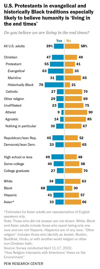 “Christians are divided on this question, with 47% saying we are living in the end times, including majorities in the historically Black (76%) and evangelical (63%) Protestant traditions. Meanwhile, 49% of Christians say we are not living in the end times, including 70% of Catholics and 65% of mainline Protestants who say this. Viewed more broadly, the share of Protestants who say we are living in the end times is greater than the corresponding share among Catholics (55% vs. 27%).”