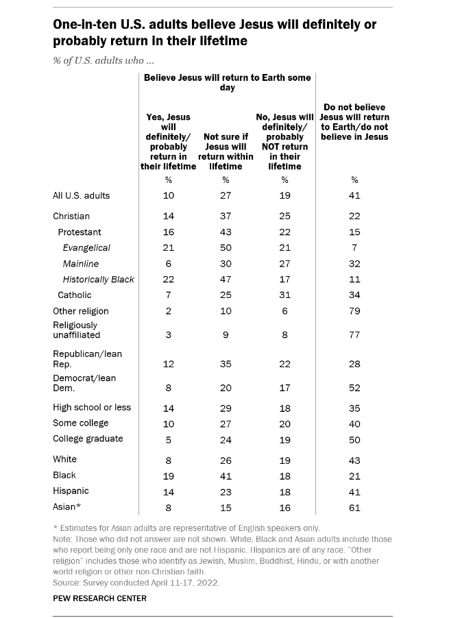 “The proportion of Americans who say they believe Jesus will definitely or probably return during their lifetime is higher among Protestants in the historically Black tradition (22%) and evangelical Protestants (21%), and lower among Catholics (7%) and mainline Protestants (6%). And the share of Black (19%) and Hispanic (14%) Americans who believe that the second coming of Jesus will likely occur during their lifetime is greater than the corresponding share of White, non-Hispanic Americans (8%).”