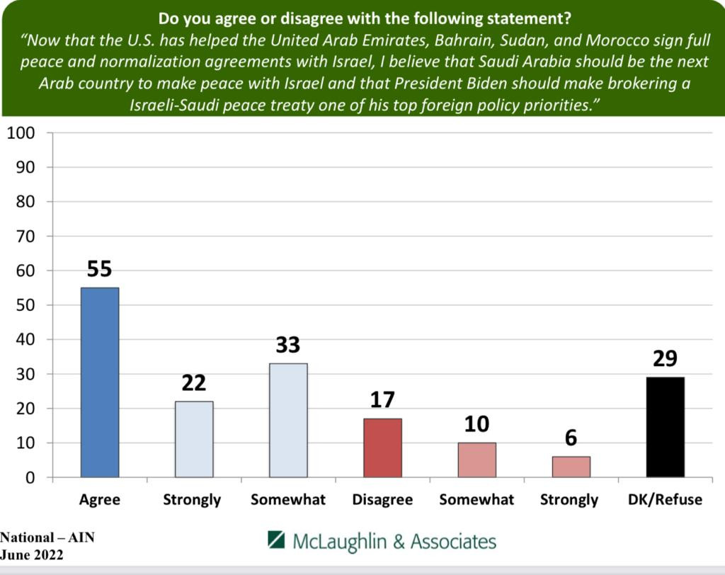 54.6% of Americans aged 18 and over say that they agree that the Saudis should make peace with Israel and Biden should make this one of his top priorities