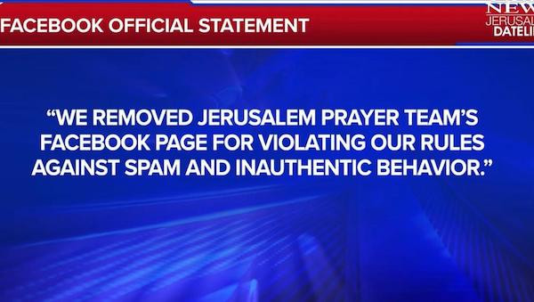 On May 21, Human Events, a prominent conservative newspaper, published its own story, reporting that Facebook had informed the Jerusalem Prayer Team executives that they had violated the terms of service, that the ban was permanent, but reported that the Big Tech giant did not explain with any specificity what the page had done wrong.