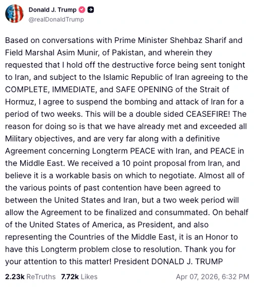 Les conditions posées par Trump pour suspendre les bombardements et les attaques contre l'Iran pendant deux semaines ont été clairement énoncées dans ses propos suivants, publiés sur Truth Social le 7 avril :