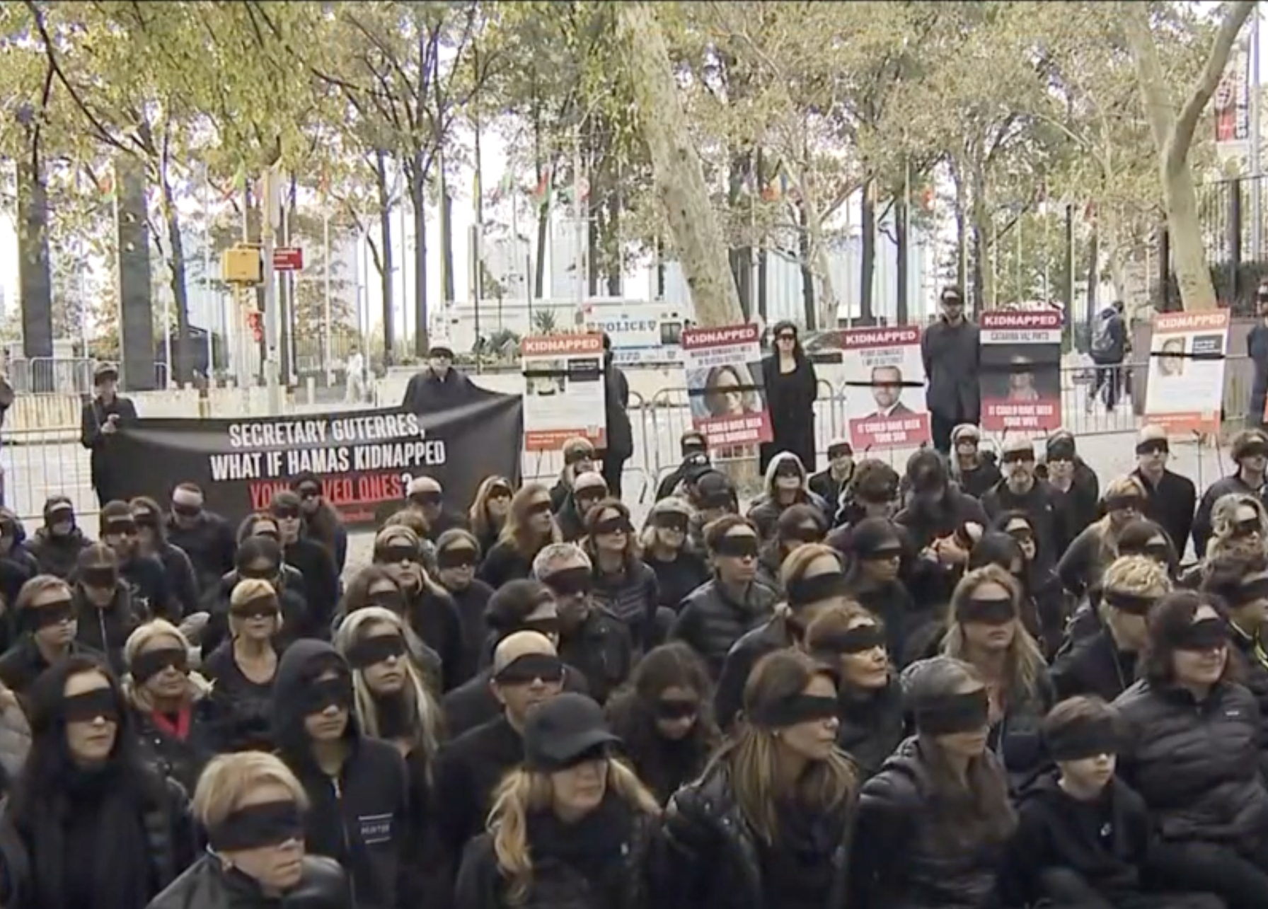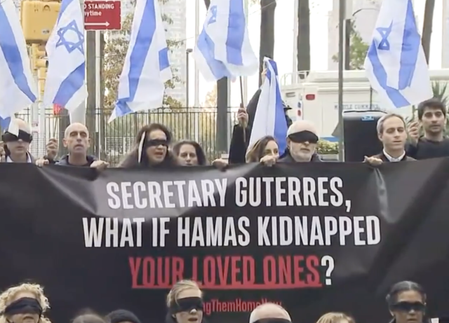 Des manifestants pro-israéliens demandent au Secrétaire général de l'ONU, M. Guterres : "Et si le Hamas enlevait vos proches ?"