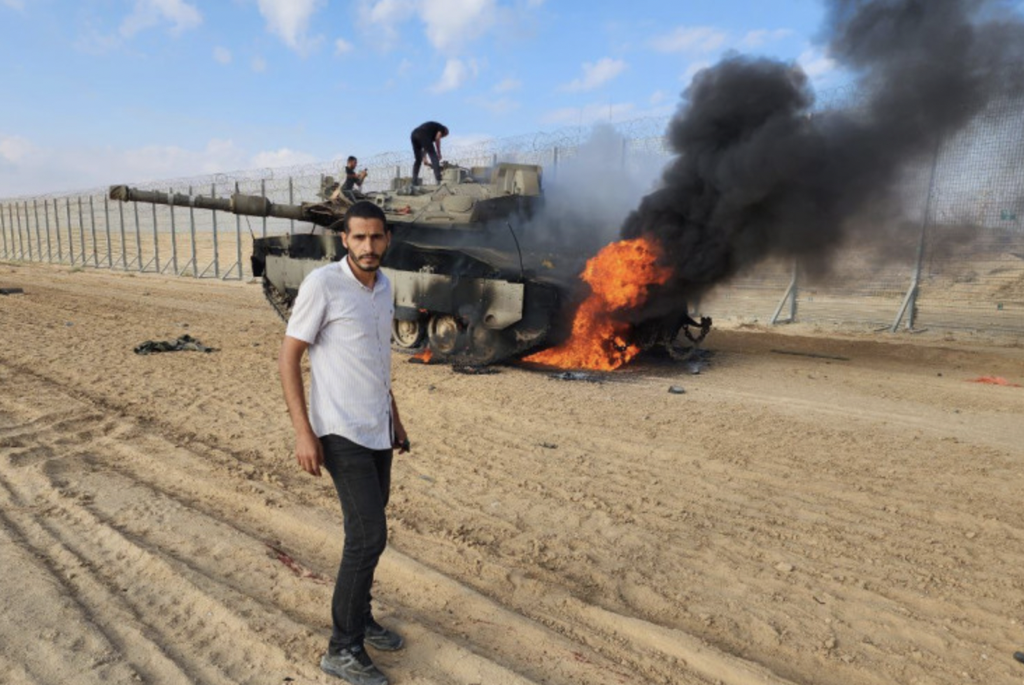 "Eslaiah, un pigiste qui travaille également pour CNN, est entré en Israël, a pris des photos d'un char israélien en flammes, puis a capturé des infiltrés entrant dans le kibboutz Kfar Aza....[P]hotos qu'il a prises à Kfar Aza montrent des terroristes du Hamas essayant de franchir la clôture du kibboutz et une maison en flammes à l'intérieur de la communauté".