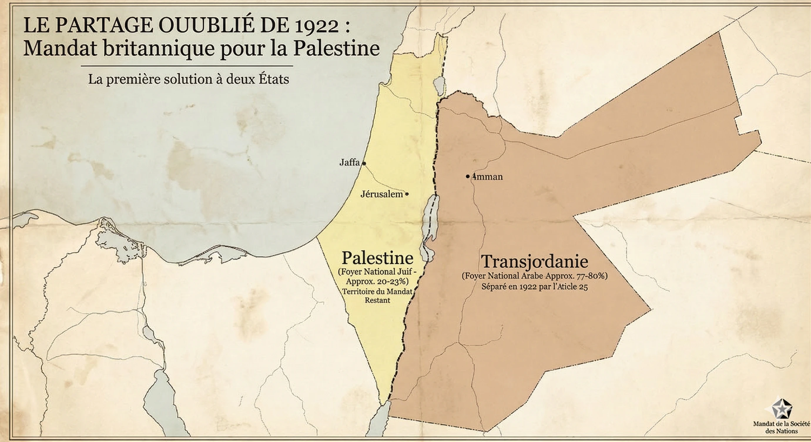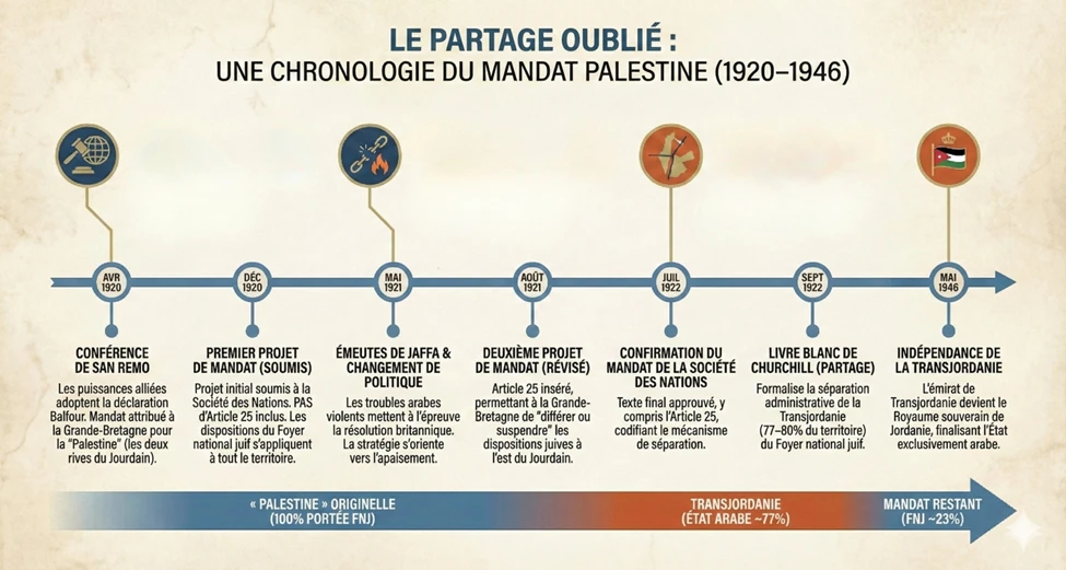 Les archives historiques révèlent une autre histoire, une partition oubliée : 77 à 80 % du mandat initial pour la Palestine est devenu l'État arabe de Transjordanie, répondant ainsi en premier lieu aux aspirations nationales arabes, tandis que la partie restante était réservée au foyer national juif. Comprendre cette géographie change tout dans le débat actuel sur l'« occupation ».