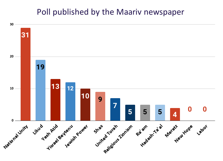 Trois partis obtiendraient 5 mandats, soit un siège de plus que le seuil électoral : Le sionisme religieux, dirigé par le ministre des finances Bezalel Smotrich, le parti islamiste Ra'am et le parti nationaliste arabe Hadash-Ta'al.