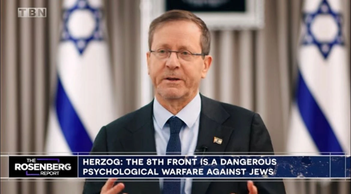 PRESIDENT ISAAC HERZOG: Well, the 8th front is not a physical front. You don’t feel it as a bomb or the shrieking noise of a missile or sirens. The 8th front is psychological warfare to undermine the right of decent human beings — the Jewish people, the People of the Book, the people of the Bible — to their most inherent rights of self-determination and their own nation-state.