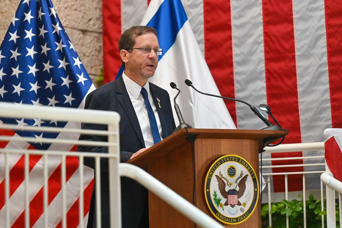 Israeli President Isaac Herzog addressed the annual American Independence Day reception hosted by U.S. Ambassador to Israel Jack Lew and his wife, Dr. Schwartz on Wednesday.