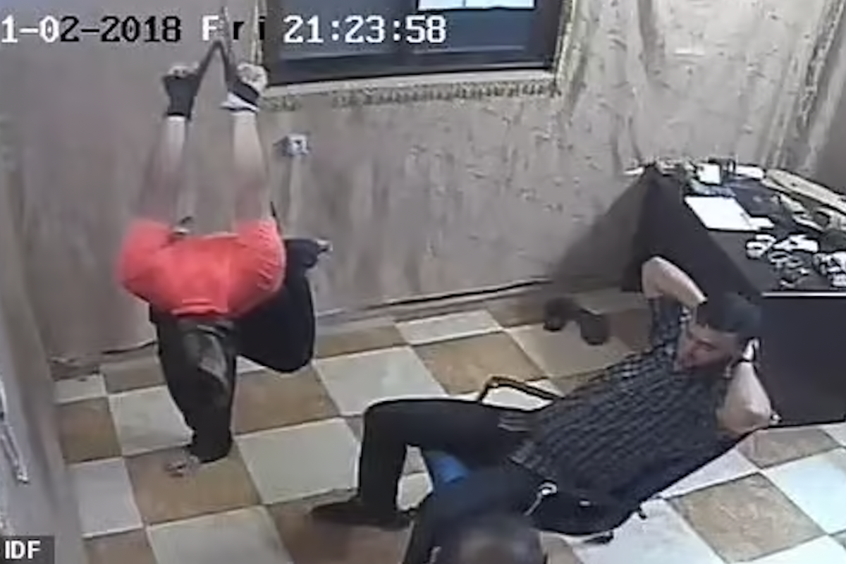 Scenes dating back from 2018 and 2019 show Palestinians with their heads covered in hoods, strung up by their hands or feet in excruciating pain. They can be trussed up and contorted awkwardly while their guards relaxed and chatted nonchalantly. In some distressing scenes, one of the captors beat a prisoner with rods on the soles of his feet as he screamed and protested. In another, a guard appeared to choke one of the prisoners even as he was tied up.
