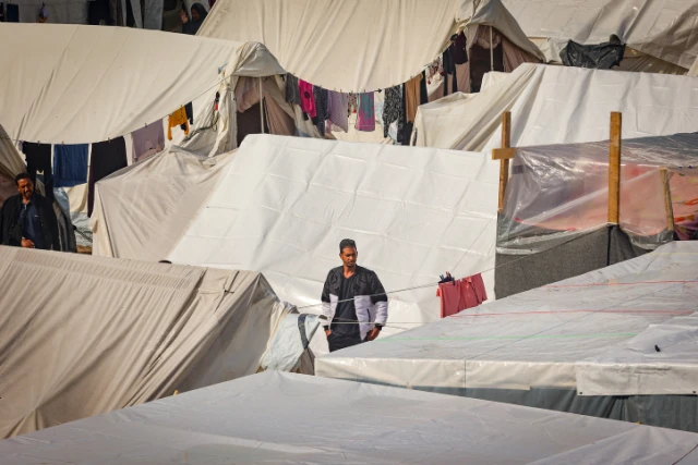 The vocational training facility in the town of Khan Younis in southern Gaza houses approximately 30,000 people, most of whom fled south as a result of the Israeli ground campaign into Gaza.
