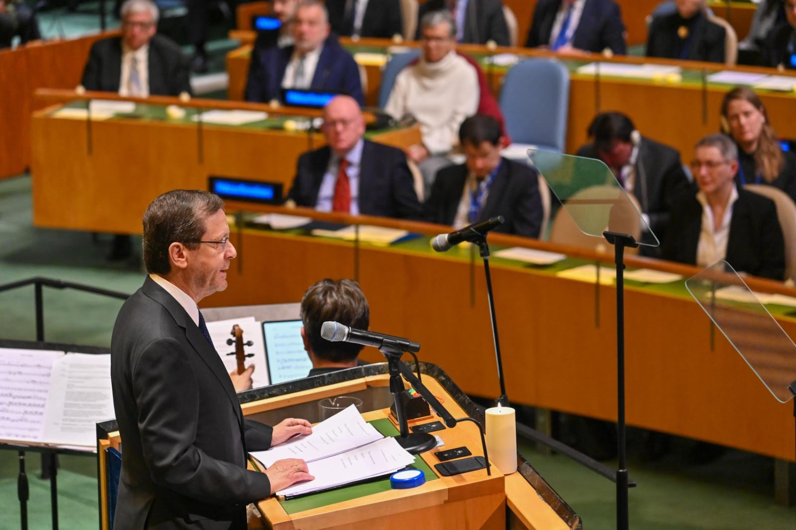 Eighty years after the Holocaust, I stand here with deep faith and hope. Our nation rose from the flames of the crematorium, not to live forever by the sword — but to build, to repair, to add light, to heal. We have stood strong against our enemies' assaults, and we have always done so – as we do today – in full compliance with international law and humanitarian norms. And no less important – we have forged alliances and peace treaties that have transformed the Middle East. I pray for the day we will achieve peace with more and more nations in our region; and that all peoples of the Middle East— Israelis, Palestinians, and all others, will live peacefully, side by side. From the ashes of Auschwitz, we built a resilient, diverse democratic society – composed of a magnificent mosaic of Jews, Muslims, Christians, Druze, Circassians and people of many faiths and lifestyles; And we have contributed to humanity, in countless fields. In Israel’s Declaration of Independence – along with extending our hand for peace – we have committed our nation to the values of liberty, equality, and justice, in faithful adherence to the principles of the Charter of the United Nations.
