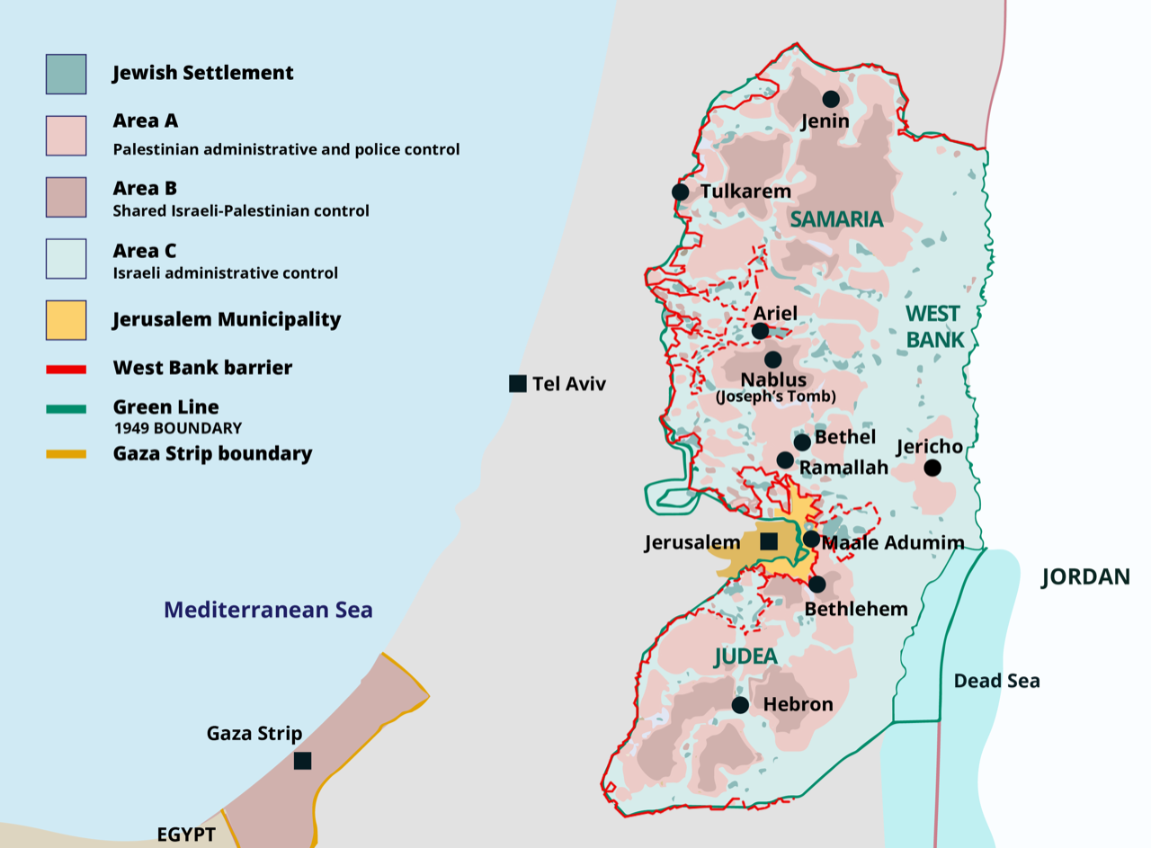 The status of the region, which had been under Jordanian occupation until Israel gained it after the Six-Day War in 1967, is considered foreign since Israel has not annexed the land. Responsibility for Areas A, B and C are divided between Israel and the Palestinian Authority.