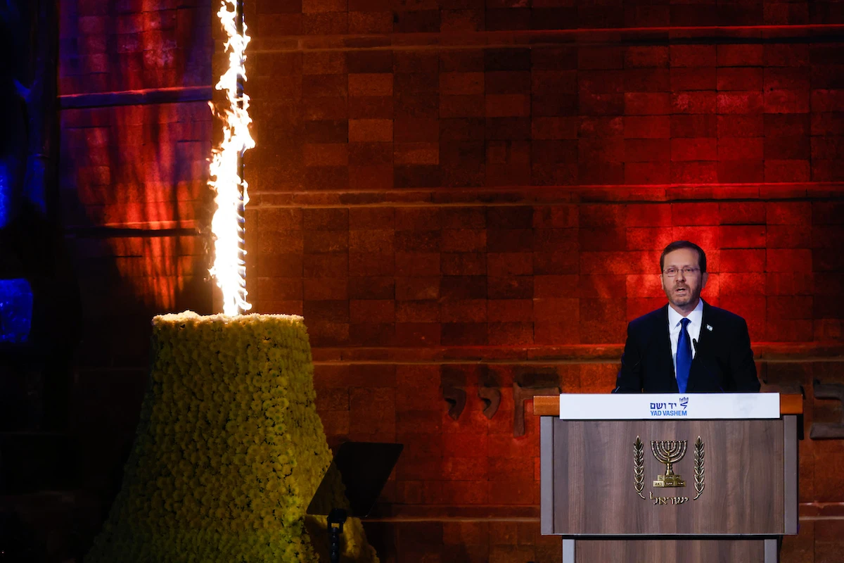 “The State of the Jews arose as a lighthouse expressing the victory of light over darkness and promising that never again will a Jewish child hide in a dark and isolated cellar from those who want him dead,” Herzog declared.
