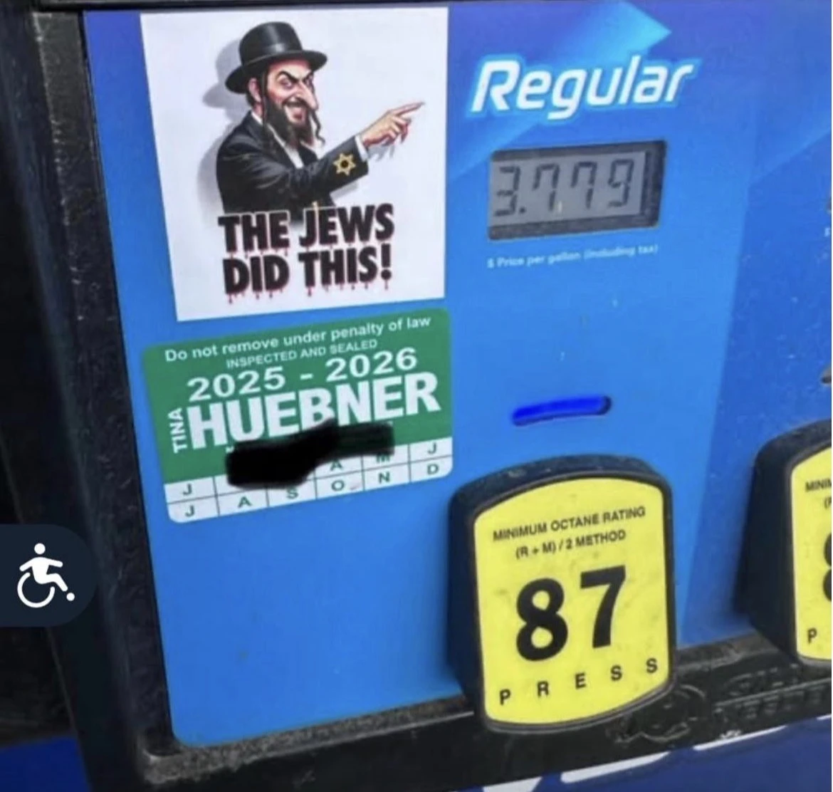최근 오하이오주의 한 주유소에서 유대인을 풍자한 스티커가 발견되었는데, 이는 주유소 펌프의 높은 가격을 가리키며 “유대인들이 이 짓을 했다!”라고 적혀 있었다. 이러한 수치스러운 이미지는 더 이상 이스라엘만을 겨냥한 것이 아니라, 그 민족성을 공유하는 모든 사람을 향한 것이다.