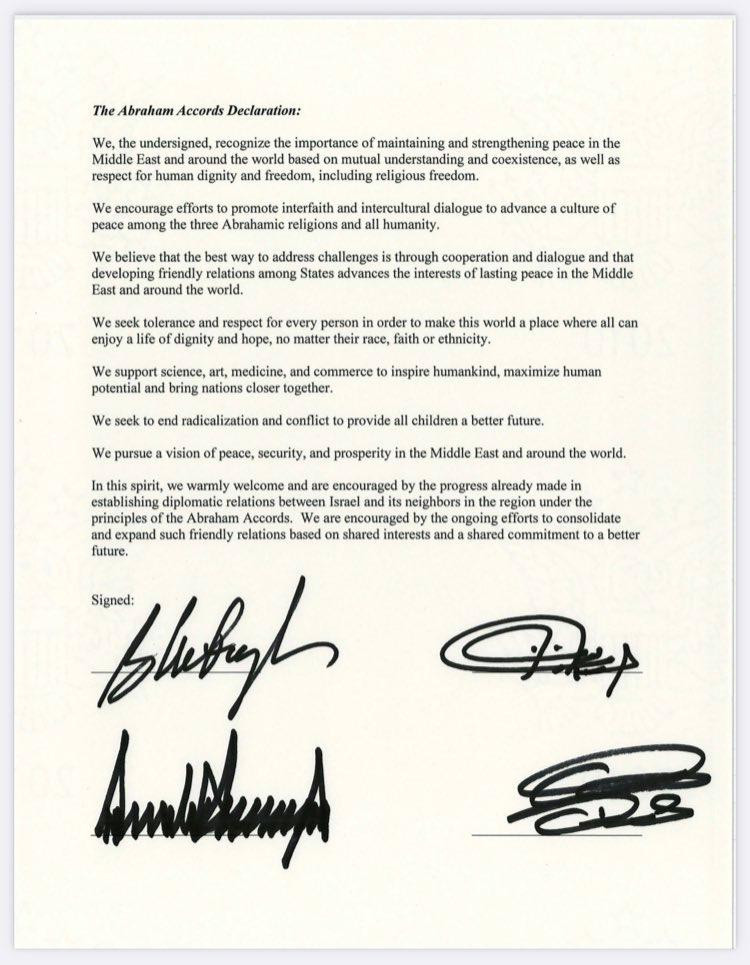 The president thanked his remarkable Middle East peace team: Vice President Pence, Secretary Pompeo, National Security Advisor Robert O’Brien, Jared Kushner, U.S. special representative for Iran Brian Hook, Avi Berkowitz, and U.S. ambassador to Israel David Friedman.