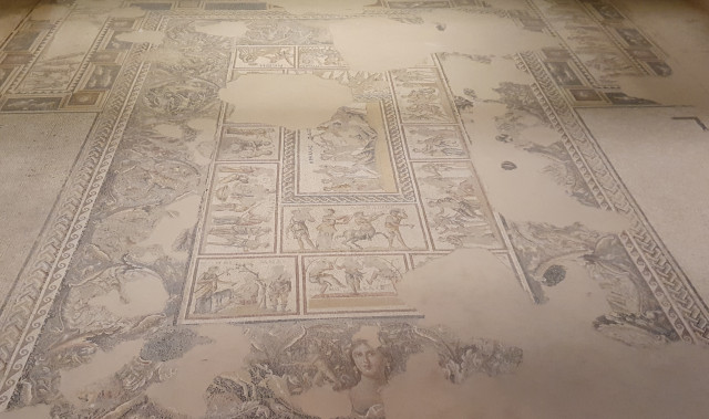One of the structures contained a mosaic depicting what seems to be a wine-drinking contest between the Greek gods Dionysus and Heracles.