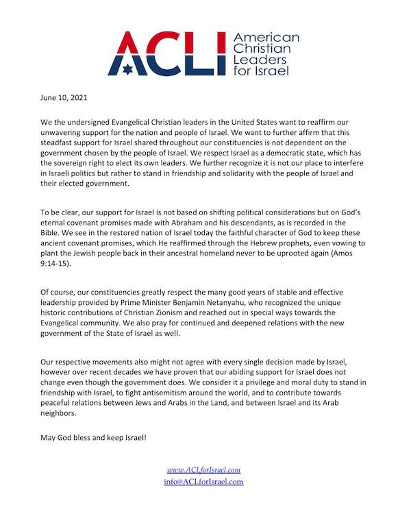 DOZENS OF ADDITIONAL CHRISTIAN LEADERS SEND LETTERS SUPPORTING NEW ISRAELI GOVERNMENT