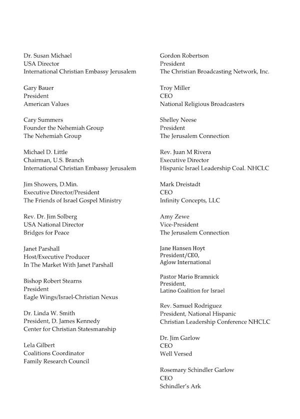 We the undersigned Evangelical Christian leaders in the United States want to reaffirm our unwavering support for the nation and people of Israel. We want to further affirm that this steadfast support for Israel shared throughout our constituencies is not dependent on the government chosen by the people of Israel. We respect Israel as a democratic state, which has the sovereign right to elect its own leaders. We further recognize it is not our place to interfere in Israeli politics but rather to stand in friendship and solidarity with the people of Israel and their elected government.