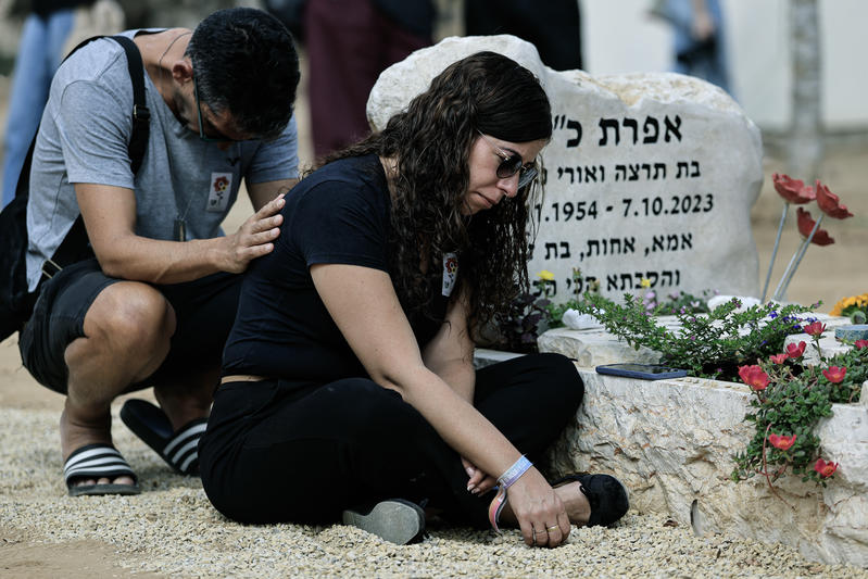 A comunidade do kibutz Nir Oz, onde 65 membros do kibutz foram assassinados ou levados em cativeiro pelo Hamas no massacre de 7 de outubro, realiza uma cerimónia fúnebre no cemitério do kibutz no segundo aniversário do 7 de outubro. 06 de outubro de 2025. Foto de Tsafrir Abayov/FLASH90