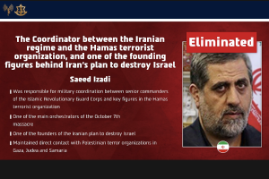 'One of the key moments of the war': Israel eliminates IRGC commander who oversaw Hamas' Oct 7 massacre All Israel News Staff June 21, 2025 HAMAS | IRGC | IRAN CONFLICT | HAMAS MASSACRE | OPERATION RISING LION | OCTOBER 7TH | IRAN PROXIES