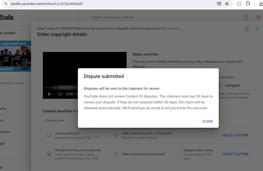 ALL ISRAEL NEWS has a signed Music License Agreement with Sperandeo and Waksman to distribute the song Ruach Adonai Alai as part of its campaign, #SetTheCaptivesFree #Isaiah61. Therefore, there is absolutely no reason for YouTube to partially block the video. Perhaps there is a deeper reason why YouTube wants to limit the audience for this prayer song video?